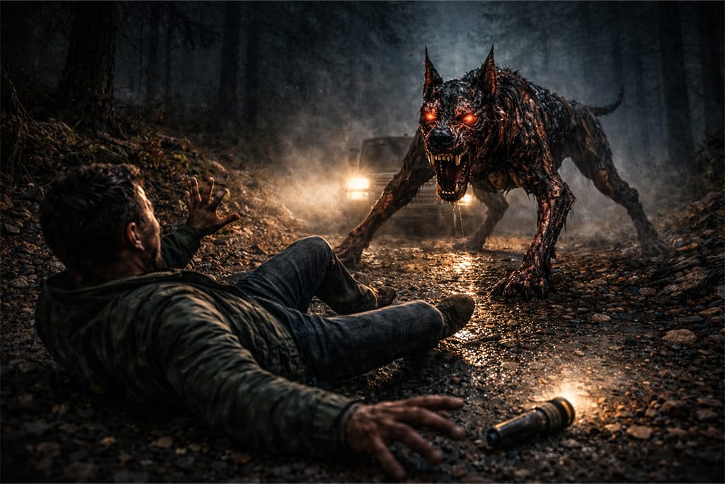 Telo mu je bilo veće i izduženije nego kod obične životinje, a prednje noge završavale su se dugim, neprirodno savijenim šapama koje su se snažno zabijale u šljunak dok je jurilo prema čoveku. Koža na njegovom telu izgledala je kao da je delimično ogoljena, sa tamnim, vlažnim mesom koje se presijavalo pod svetlom farova.